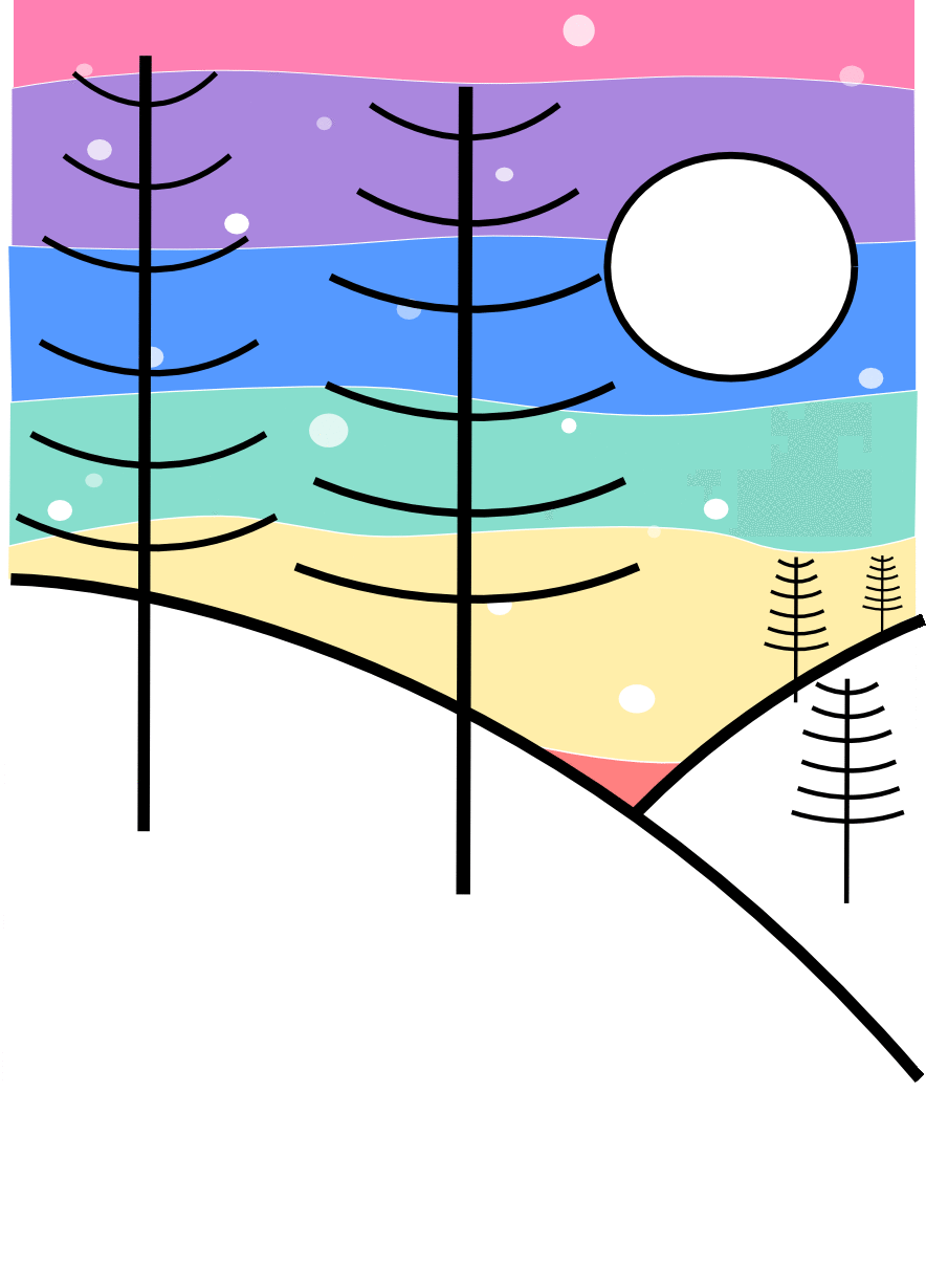 We used lots of shapes and colors to create this snowy scene, and using the same program (inkscape) we later animated the scene by moving shapes and changing the opacity (see through) of other things